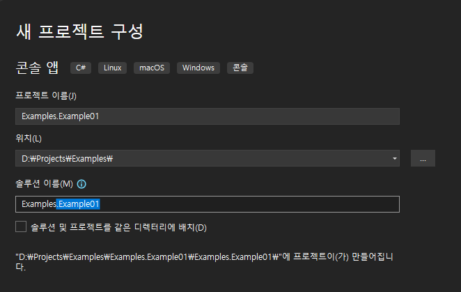 프로젝트 이름에는 "Examples.Example01"을 입력합니다.