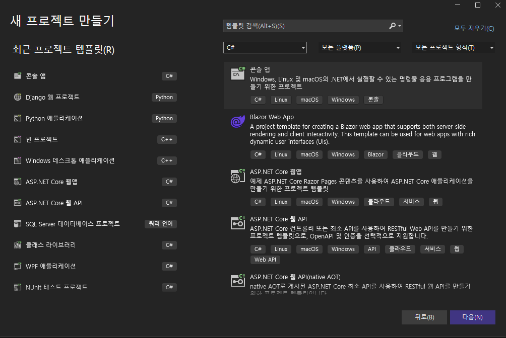 우측 창에서 [모든 언어] 에서 [C#]을 선택해 주세요. 그러면 좀 더 원하는 템플릿을 찾아보기 쉬울 겁니다.