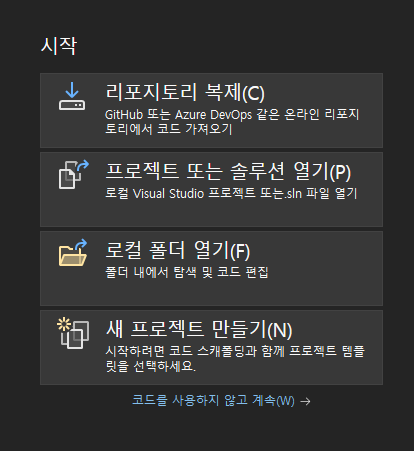 VS를 실행하면 나오는 초기 메뉴 우측에 보면 [새 프로젝트 만들기]가 있습니다.