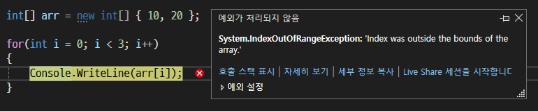 그리고 arr[2]는 존재하지 않으므로, 존재하지 않는 인덱스에 접근하려고 하자 C# 컴파일러가 오류를 출력하게 되는 겁니다.