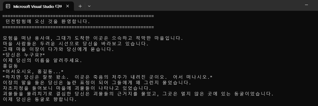 그림과 같이 우리는 이야기를 읽고, 이름으로 "홍길동"을 입력하여 마을 이장과 인사를 나누었습니다.