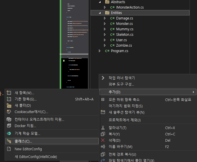 Entities폴더에서 우클릭하여 [추가] - [클래스]를 선택합니다.