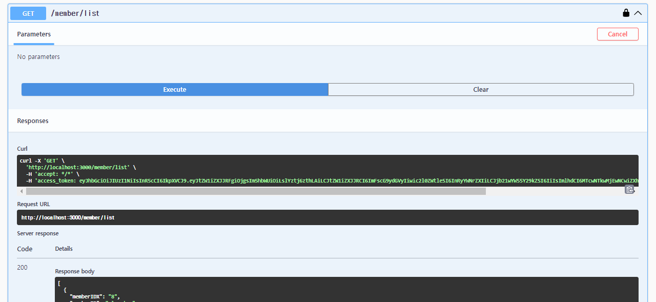 네 Curl 부분에 보면 요청한 access_token에 우리가 Authorize에 입력한 토큰 값이 전달되는게 보일 겁니다.