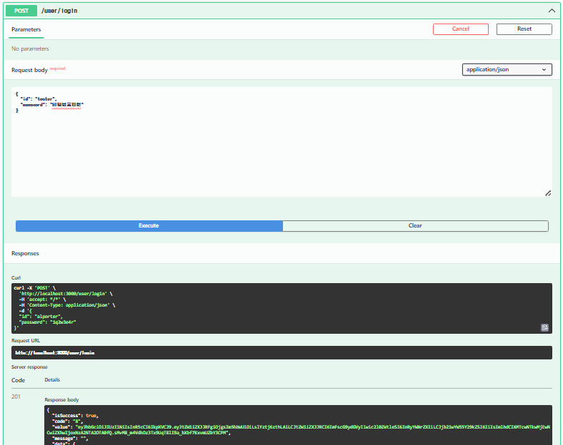 이제 이걸로 Swagger에서 로그인을 시도하면 정상적으로 로그인 성공시 JWT 토큰이 반환되는 것을 볼 수 있습니다.