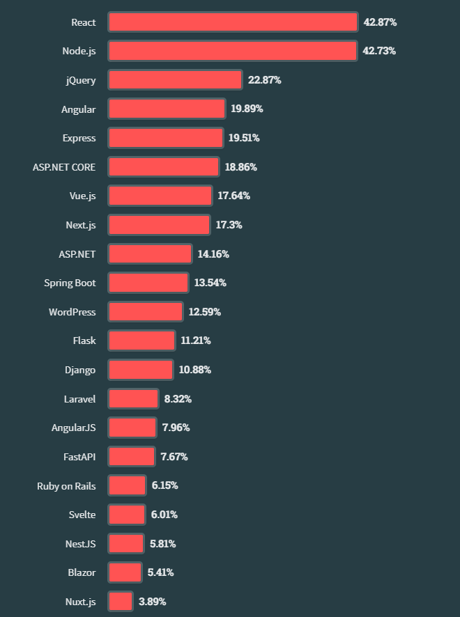 가장 핫한 주제죠. 역시나 React와 Node.js가 압도적인 1,2위를 차지하고 있습니다.