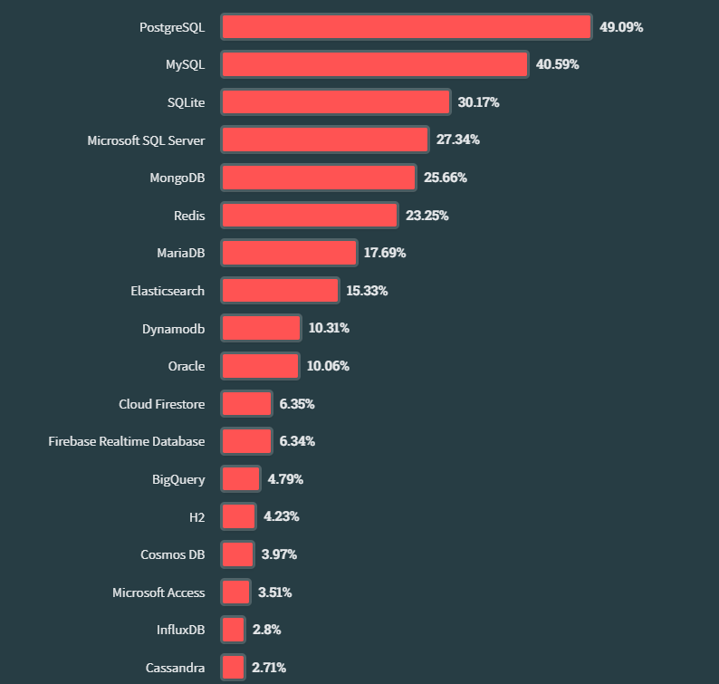 SQLite는 모바일앱때문에 점유율이 높은 것 같고 다음으로 MS-SQL 순이네요.