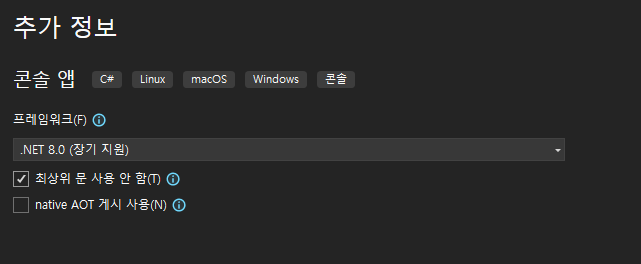 다음과 같은 화면이 나오면 .NET 8.0 혹은 개발 시점과 환경에 따라 선택할 수 있는 가장 최신 버전을 선택해 주세요.