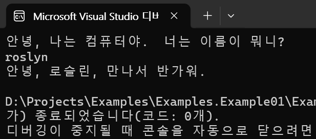 이번에는 Roslyn이란 이름을 입력하자, 원래대로 인삿말이 출력됩니다.