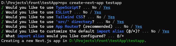 (3) 실행하면 설치에 관련된 요소들에 대해 질문하며, 적절히 답변하면 Next.js가 생성됩니다.